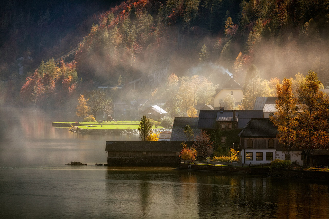 A photograph of Hallstatt a stunning 16th century Austrian town located on the lake shore. The autumn trees and small stone houses are veiled in a thin layer of mist shining in the rays of morning sun.
