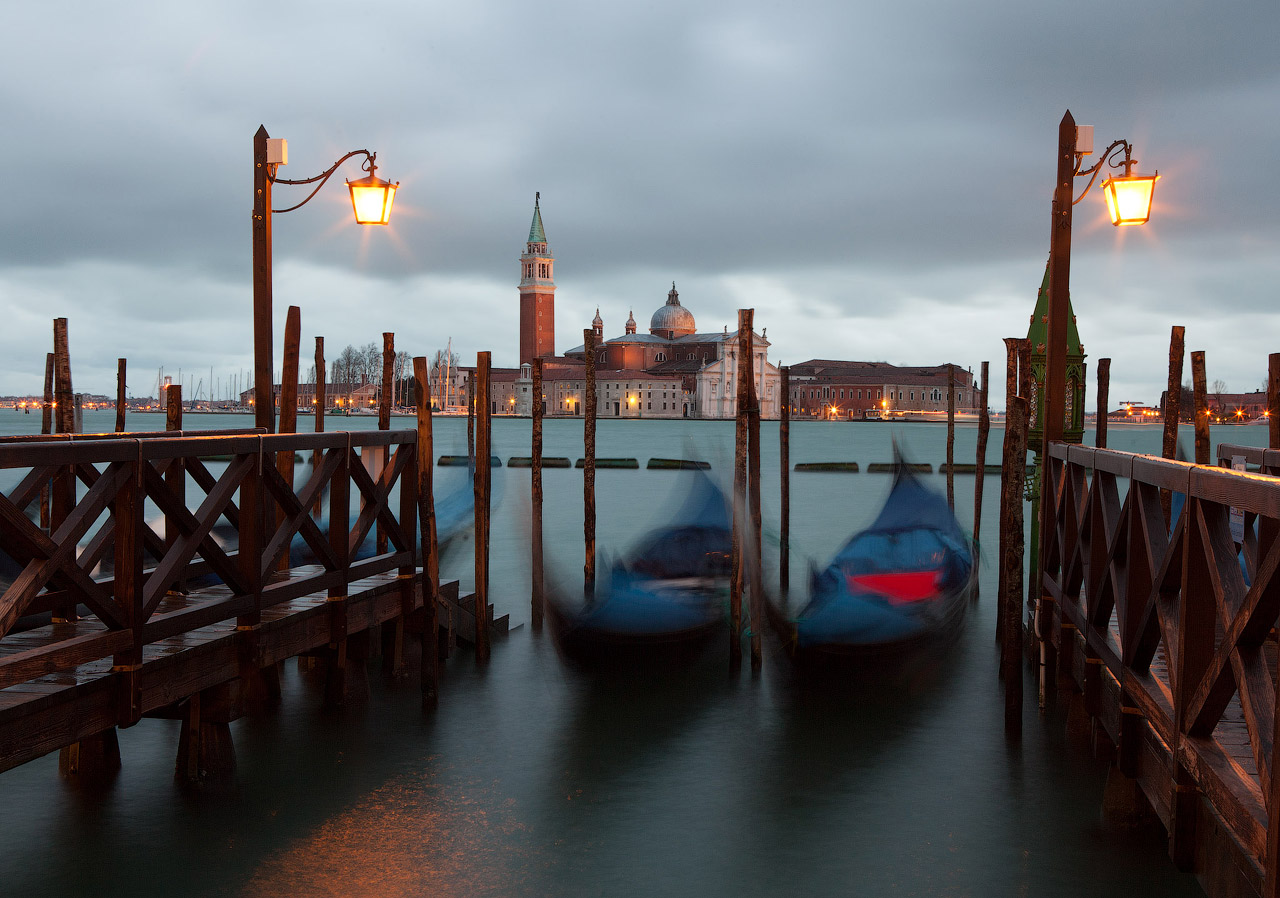 A poster illustrating a venetian wooden pier. Two gondolas are tied to the pier, calmly floating in the still water, inviting you to step in them. You can feel the silence of the early morning and the peaceful atmosphere of the Italian waterfront.